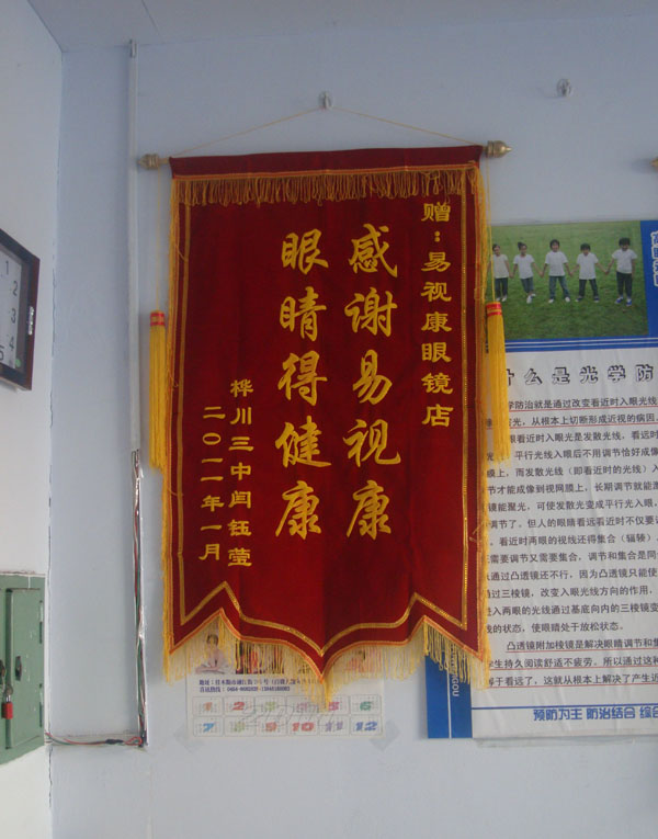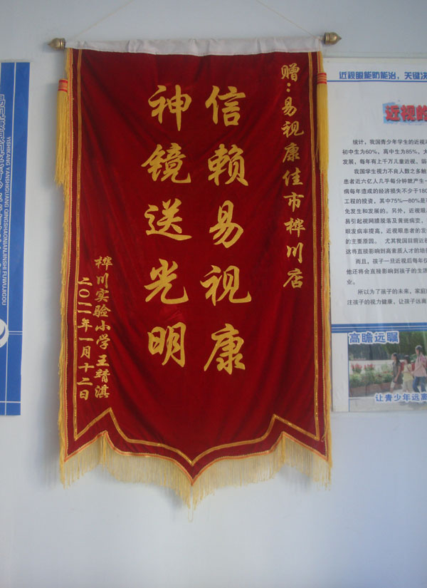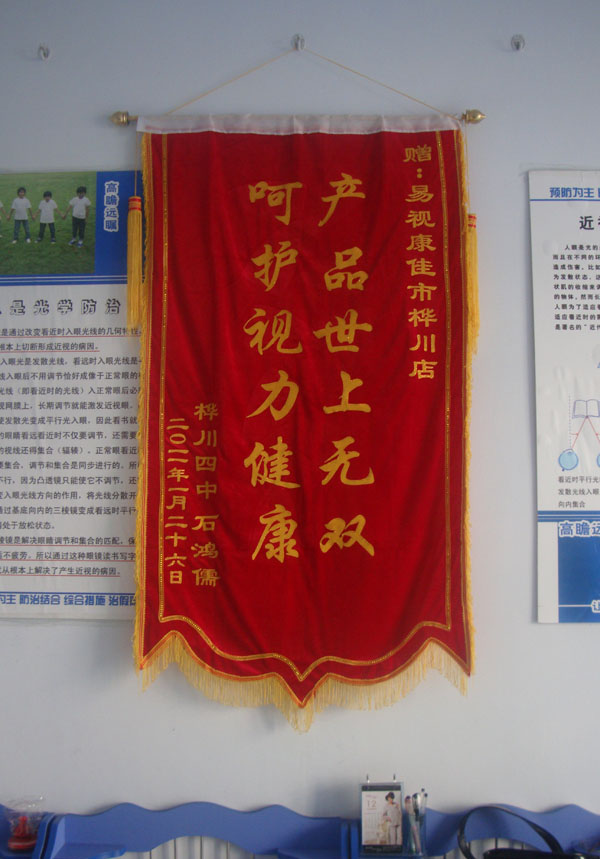 樺川實驗小學(xué)王靖淇贈送錦旗“信賴易視康,神鏡送光明”;樺川四中石鴻儒贈送錦旗“產(chǎn)品世上無雙,呵護視力健康”;樺川三中閆鈺瑩贈送錦旗“感謝易視康,眼睛得健康”等。